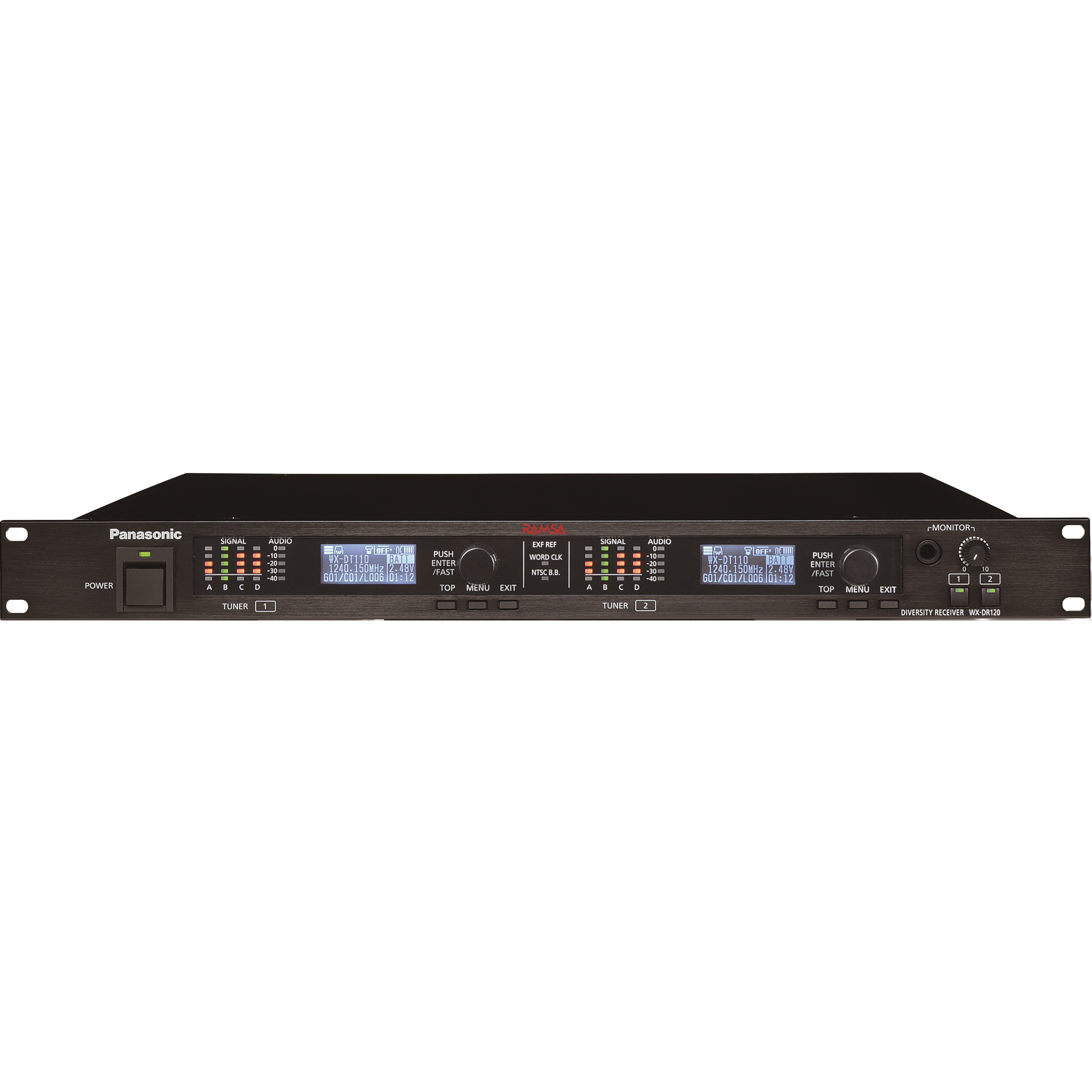 WX-DR120:多チャンネル、高機能な据え置き型1U受信機。4系統のダイバーシティ受信方式の採用により、安定した受信を実現